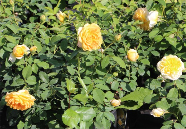 Abraham Derby Английская кустовая роза, высотой до 120 см. Цветы крупные, 8-10 см в диаметре, очень махровые, желтые, чашевидные, с сильным фруктовым ароматом, листва темно-зеленая, полуглянцевая.